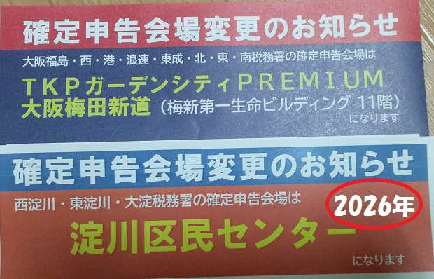 確定申告の季節です。 大阪市内にお住まいの方で、 ・大淀税務署 ・東淀川税務署 ・西淀川税務署 管轄の方は、ご注意ください。 上記三署の方の合同会場は、淀川区民センターです。 ↓税務署からのお知らせ↓ (合同会場)淀川区民センターで行います https://www.nta.go.jp/about/organization/osaka/topics/kakutei_shinkoku/pdf/28. […]